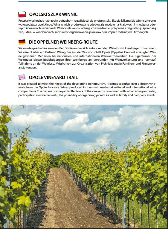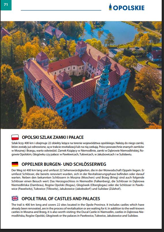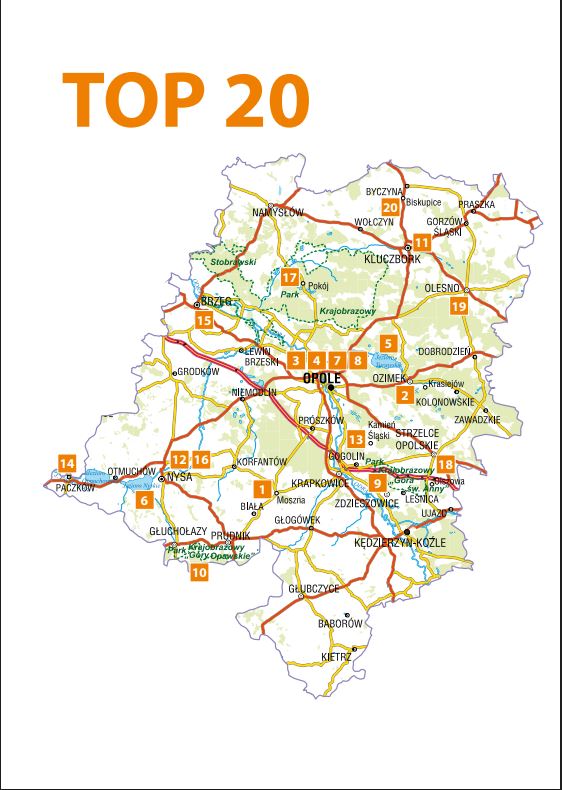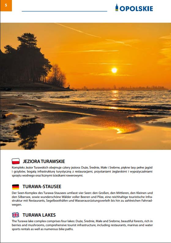 Publikacja opracowana na zlecenie Województwa Opolskiego, zawierająca TOP 20 najważniejszych atrakcji turystycznych znajdujących się na terenie województwa opolskiego. Publikacja podzielona została na 6 bloków tematycznych: - atrakcje dla całej rodziny, - zabytki staromiejskie, - muzea, - zabytki sakralne, - parki, - szlaki turystyczne. Publikacja przetłumaczona łącznie na 4 języki obce wydana w 2 wersjach (polsko-angielsko-niemieckiej oraz polsko-czesko-ukraińskiej).