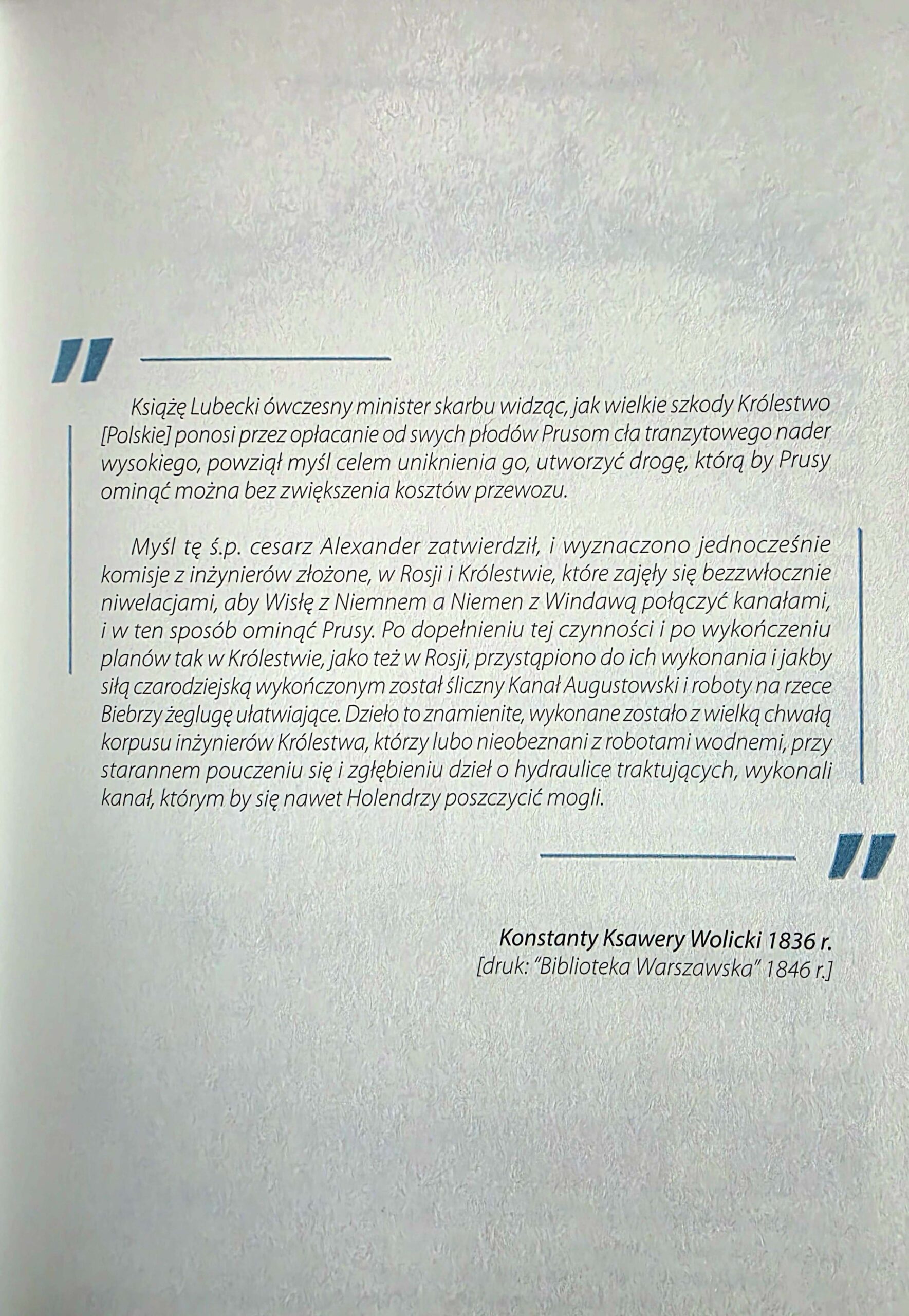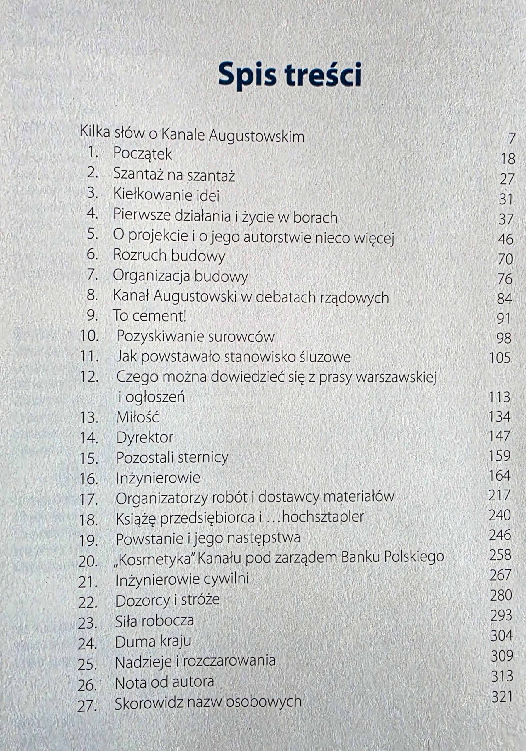 Książka w formie gawędy omawia historię budowy Kanału Augustowskiego (1823-1840). Przedstawia okoliczności polityczne jej podjęcia, prace przygotowawcze nad projektem i jego autorstwo, organizację budowy, pozyskiwanie materiałów, przebieg prac. Dużo miejsca poświęca życiu prywatnemu budowniczych - szczególnie gen. Ignacego Prądzyńskiego oraz "sterników" inwestycji. Przedstawia losy inżynierów. Ujawnia rolę przedsiębiorców budowlanych i dostawców, dozorców i stróży, siłę roboczą. Niektóre z wątków są wręcz sensacyjne. Tekst zamykają rozdziały o rozgłosie, jaką zyskała inwestycja i przyczynach jej niepełnego wykorzystania. Autor - znawca tematu (emerytowany kustosz Muzeum Ziemi Augustowskiej) - wobec zniszczenia podstawowych źródeł w XX wieku - oparł się na materiale pozyskanym z kwerendy w wielu placówkach. Pozycja została bogato zilustrowana mało znaną ikonografią. Jej uzupełnieniem są barwne reprodukcje trzech planów z I połowy XIX wieku.