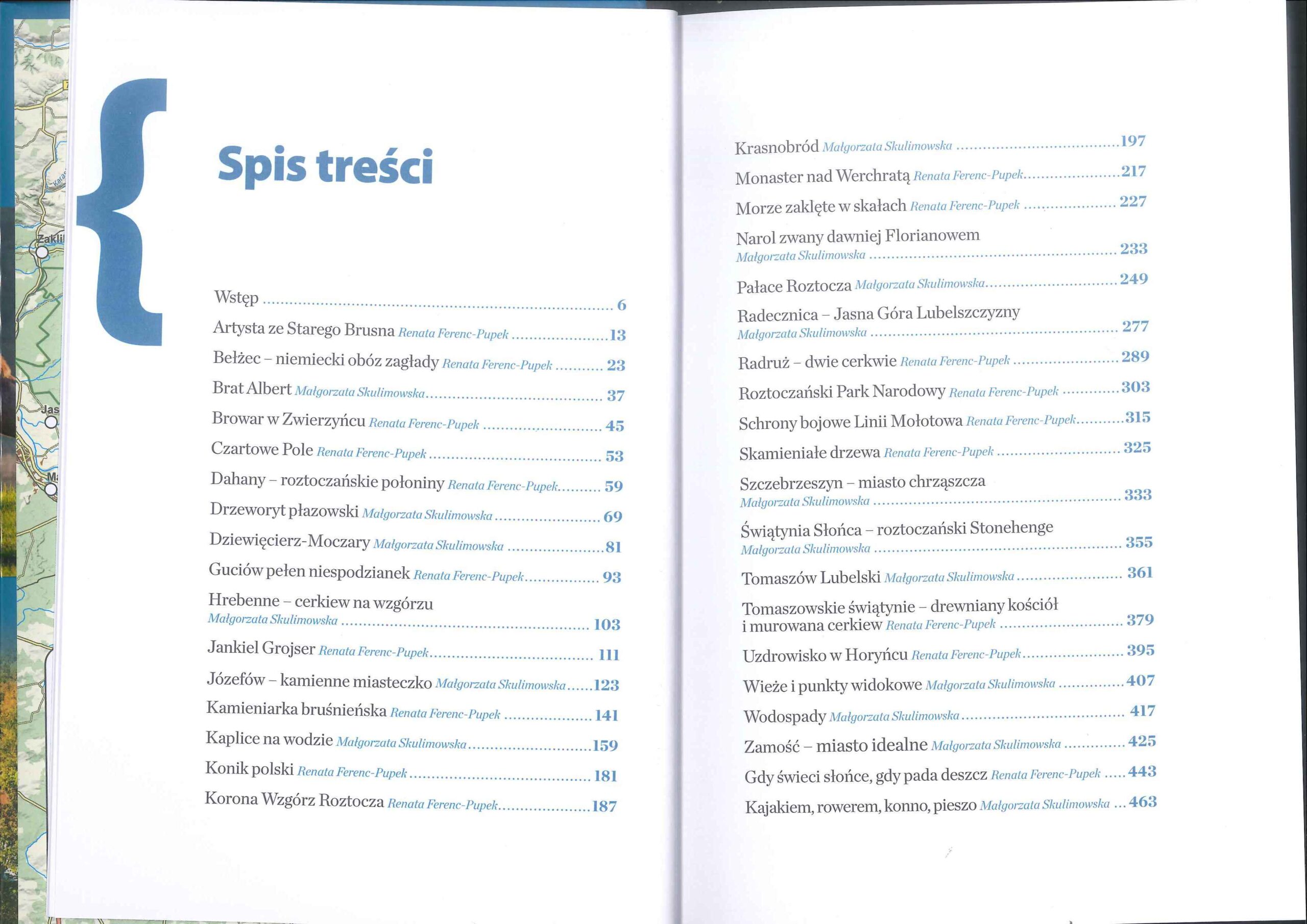 Publikacja obejmuje rozdziały m.in o Grzegorzu Kuźniewiczu – artyście ze Starego Brusna, niemieckim obozie zagłady w Bełżcu, św. Bracie Albercie, browarze w Zwierzyńcu, Czartowym Polu, Dahanach – roztoczańskich połoninach, drzeworycie płazowskim, Dziewięcierzu-Moczarach, Guciowie pełnym niespodzianek, cerkwi w Hrebennem, ostatnim szczebrzeszyńskim Żydzie – Jankielu Grojserze, kamiennym miasteczku – Józefowie, kamieniarce bruśnieńskiej, koniku polskim, Koronie Wzgórz Roztocza, Krasnobrodzie, monasterze nad Werchratą, morzu zaklętym w skałach, Narolu zwanym dawniej Florianowem, roztoczańskich pałacach, Radecznicy – Jasnej Górze Lubelszczyzny, dwóch cerkwiach w Radrużu, Roztoczańskim Parku Narodowym, schronach bojowych Linii Mołotowa, skamieniałych drzewach, Szczebrzeszynie, Tomaszowie Lubelskim, Świątyni Słońca, uzdrowisku w Horyńcu, Zamościu, wodospadach, a także wieżach i punktach widokowych.