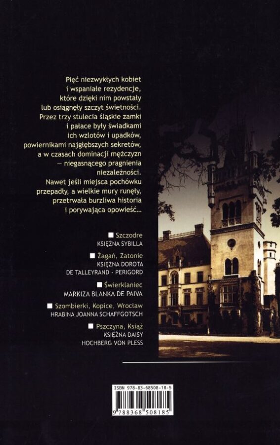Pięć niezwykłych kobiet i wspaniałe rezydencje, które dzięki nim powstały lub osiągnęły szczyt świetności. Przez trzy stulecia śląskie zamki i pałace były świadkami ich wzlotów i upadków, powiernikami najgłębszych sekretów, a w czasach dominacji mężczyzn — niegasnącego pragnienia niezależności. Nawet jeśli miejsca pochówku przepadły, a wielkie mury runęły, przetrwała burzliwa historia i porywająca opowieść…